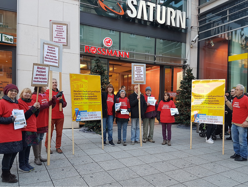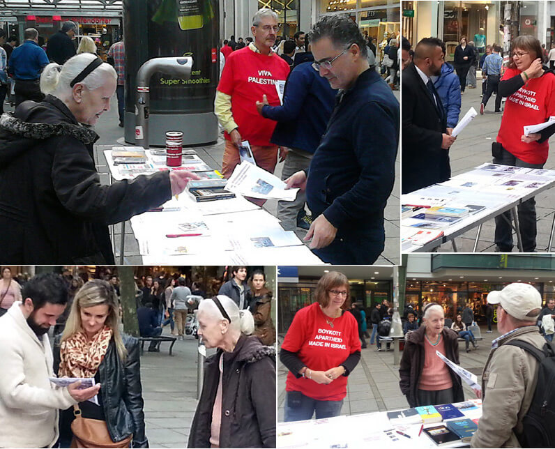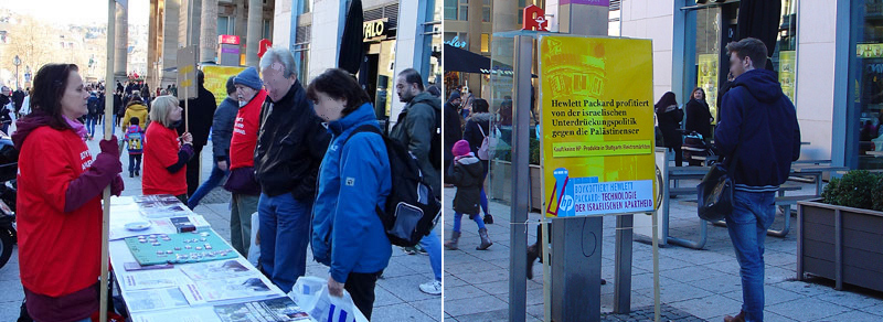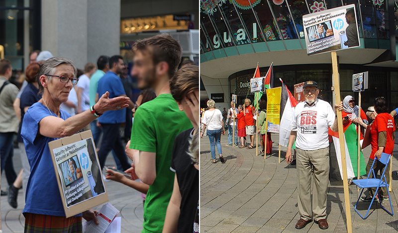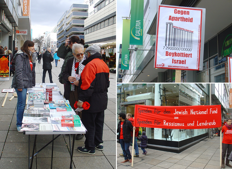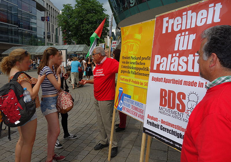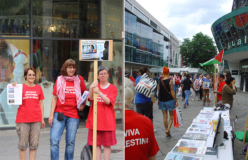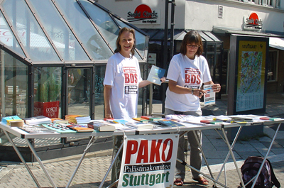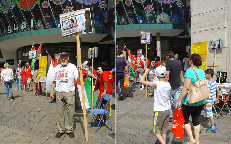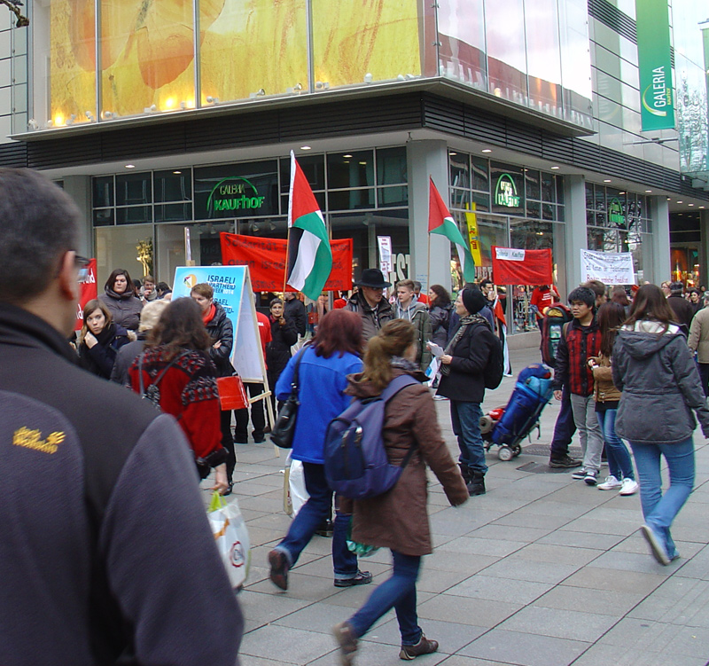BDS-Aktion auf der Königstraße in Stuttgart am 2. Juli 2011Karstadt Stuttgart verkauft Produkte aus illegalen israelischen Siedlungen in Palästina
