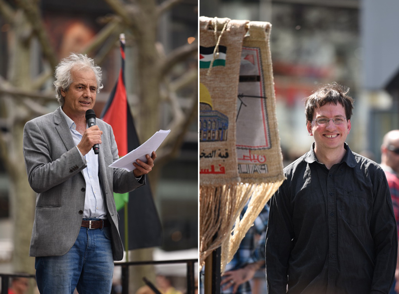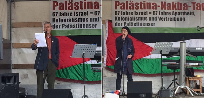 Links: Redebeitrag von „Palästina spricht“; rechts: Pako-Rede