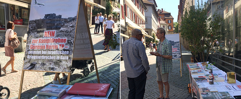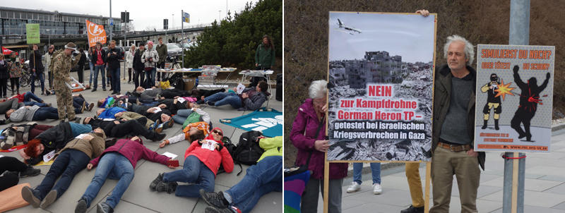 Die Überwindung von Fluchtursachen und die Sicherheit für Flüchtlinge, die Schließung der US-Kommandozentralen EUCOM und AFRICOM, die Beendigung der Auslandseinsätze der Bundeswehr, der Stopp des Ausbaus der EU zur Militärunion waren einige weitere Forderungen der diesjährigen Ostermärsche. Ein wichtiges Thema ist jedoch auch die Bestrebung, die Bundeswehr mit bewaffneten Drohnen auszurüsten, dafür ist die israelische Drohne Heron TP über Airbus beschafft worden. Für welche Einsätze diese Drohnen konstruiert sind, zeigt das Palästinakomitee auf seinem Plakat mit einem Foto von der Zerstörung in Gaza 2014. Dort kommen regelmäßig die Heron TP sowie andere Heron Drohnen von IAI (Israel) und Elbit (Hermes, die auch für Frontex beschafft wurden !) zum Einsatz. Die Bewaffnung der Heron TP scheiterte bisher am Widerstand von linken Kräften in der SPD. Tobias Pflüger (MdB Die Linke und Mitbegründer von Informationsstelle Militarisierung Tübingen) erinnerte jedoch daran, wie klar die Weichen gestellt sind, am 14. April soll trotz allem über die Finanzmittel für die Eurodrohne abgestimmt werden, die bewaffnet geplant ist.