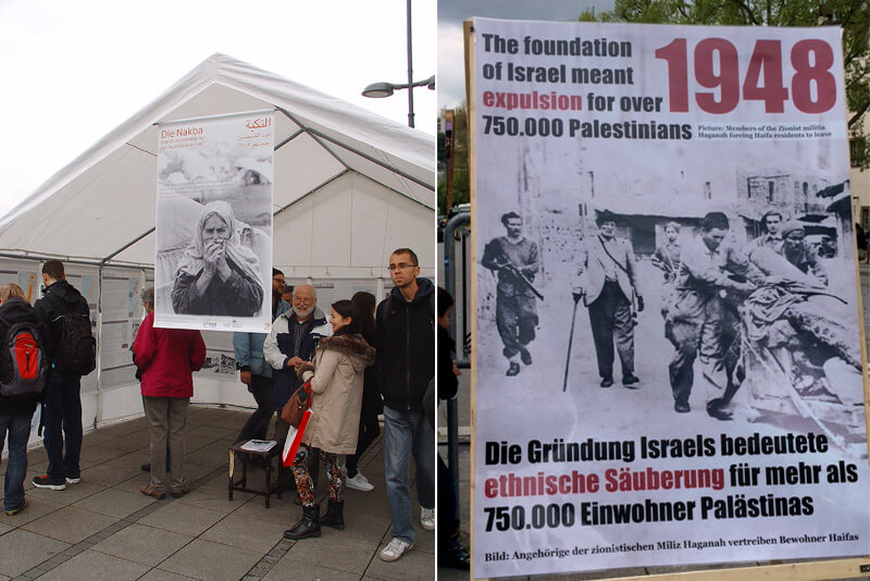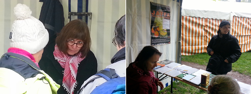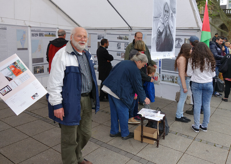 | Links: Das Zelt mit der Nakba-Ausstellung war gut besucht; rechts: Karl Schmidt (Pfarrer a.D.), Initiator der "Freiheit für Nelson Mandela Kampagne" in Apartheid-Südafrika, hält eine Rede (Seine Rede hier als PDF) |