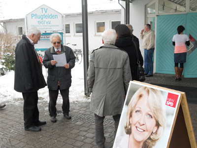 Mitglieder des Palästinakomitee Stuttgart haben am Samstag, 19. Januar 2013, auf einem SPD-Neujahrsempfang in Ludwigsburg direkt mit SPD-Parteimitgliedern Kontakt aufgenommen. Prominente Rednerin war die nordrhein-westfälische Ministerpräsidentin Hannelore Kraft, die 250 Besucherinnen in die Halle nach Ludwigsburg-Pflugfelden lockte. Der Protestbrief mit 700 Unterschriften gegen die Förderung des Jüdischen Nationalfonds-KKL (JNF) mit einem SPD-Wald erregte jedoch ebenfalls einiges Aufsehen. Einzelne Parteimitglieder hatten unseren Brief sogar bereits unterzeichnet. Im Saal bildeten sich anschließend kleine Gesprächsgruppen, die sich über die Situation in Palästina/Israel und die Apartheid made by JNF austauschten.
