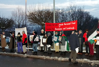 Ein kalter, rutschiger Abend in Esslingen. Glatteis überall. Trotzdem sind ungefähr zwanzig Musikgenießer im Theodor-Rotschild-Haus in Esslingen zusammengekommen, um Leonie Rettigs Interpretation von List und Brahms zu erleben. Anlass war eine Benifizveranstaltung der Deutsch-Israelischen-Gesellschaft Stuttart (u.a.) für den geplanten SPD Wald im Negev. Man hatte bestimmt auf mehr Interesse gehofft aber, nach einer intensiven Gegenkampagne des Palästinakomitees Stuttgart, ist die Veranstaltung eher von potentiellen Spendern gemieden worden. Wir sind in Kontakt mit mehreren führenden SPD-Mitgliedern getreten und unser Aufruf im Internet hat eine breite Unterstützung erfahren. Amnesty International („Hört auf das Leben der Beduinen zu zerstören“) hat ihren Lesern vorgeschlagen, unseren Aufruf zu unterstützen. Unser Appell hat viele (deutlich mehr als die Zahl der Besucher) AktivistInnen Christen, Linke, Juden, Muslime, und Nichtgläubige aus Baden-Würrtemberg zusammengebracht, die trotz unangenehmer Kälte vor dem Theodor-Rotschild-Haus demonstriert haben. Wir konnten nicht sehr viele Flugis verteilen, da es nur eine sehr begrenzte Anzahl von Besuchern gab. Die meisten waren aber an unseren Infos interessiert. Im Schatten deutscher BäumeOffener Protestbrief an die SPD wegen ihrer Spendensammelaktion für den JNF Say no to the racism of the Jewish National Fund Open Letter to supporters of the Forest of German States in the Negev