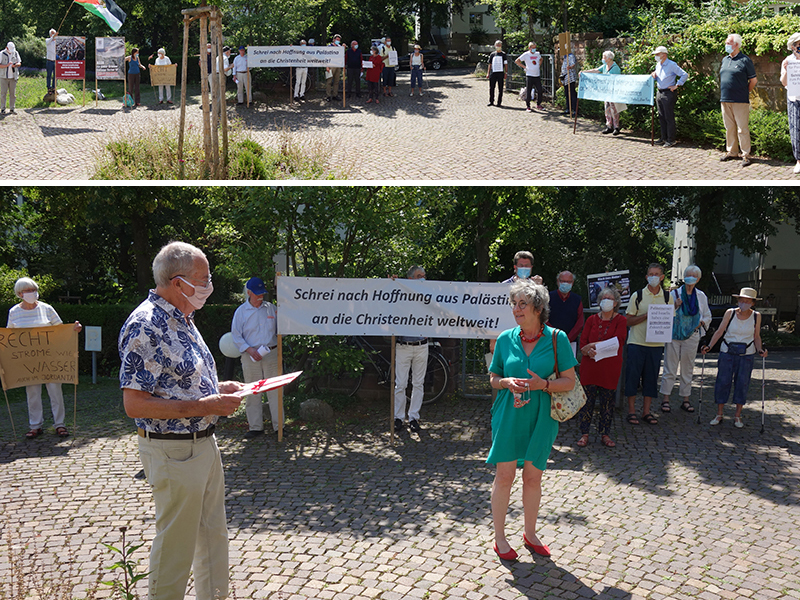 Von Berlin über Düsseldorf, Greifswald, Karlsruhe, Oldenburg bis Stuttgart, an 24 Orten in der gesamten Bundesrepublik versammelten sich am Freitag, 26. Juni 2020, Mitglieder und Unterstützer der Netzwerke von Kairos Palästina (Kairos Palästina Solidaritätsnetzwerk) und Freunde von Sabeel. Vor Bischofssitzen, Landeskirchenämtern sowie Ordinariaten erinnerten sie so an den Appell der palästinensischen Christen an die Christen in aller Welt, die Unterstützung in einer extremen Notlage anforderten.