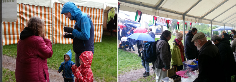 | Links: Felicia Langer hält ihre Rede trotz des Regens; rechts: Unser Tisch mit palästinensischem Gebäck war sehr beliebt... | |||||||||||||||||||||||||||||||||