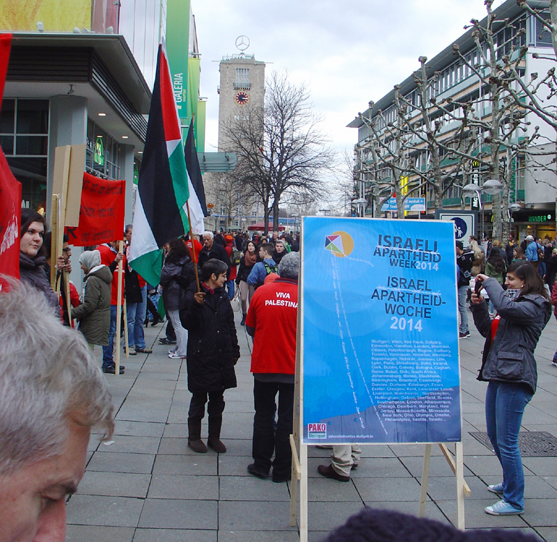 Im Rahmen der internationalen Israel-Apartheidwoche haben wir vor der Galeria Kaufhof in der Stuttgarter Innenstadt eine BDS-Aktion organisiert.