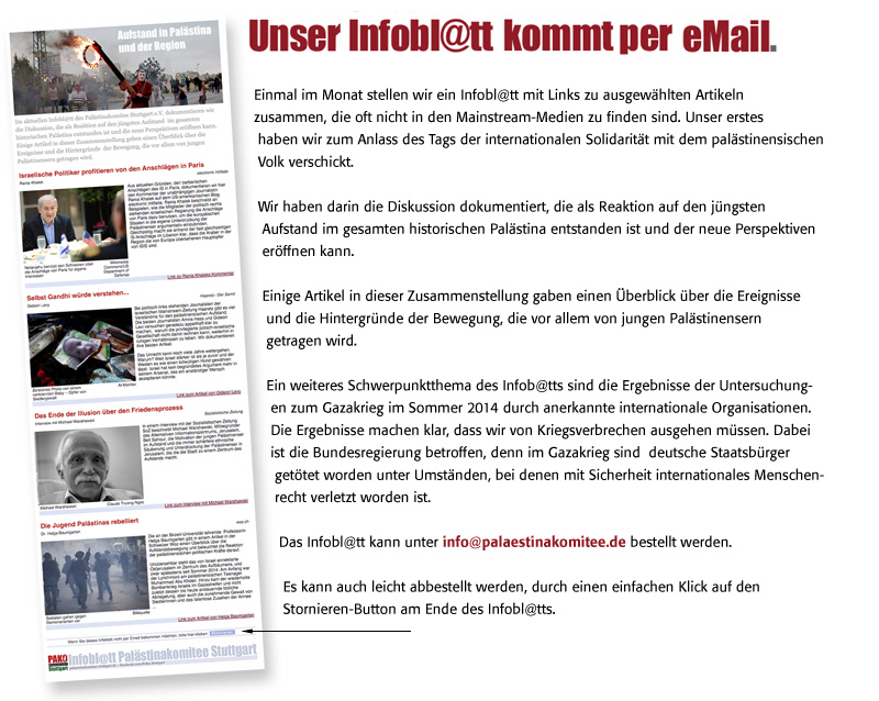 Palästina-Info Spezial: Palästina-Solidarität Region Basel in Zusammenarbeit mit dem Palästinakomitee Stuttgart und BDS Schweiz Die 40-seitige Broschüre soll die internationale Kampagne „Stop the JNF“ im deutschen Sprachraum unterstützen und bekannt machen. Die Kampagne will über die zentrale Rolle des JNF/KKL bei der Umsetzung der zionistischen Politik aufklären. Dazu gehören die andauernde Vertreibung der palästinensischen Bevölkerung von ihrem Land, die Enteignung ihres Landes und Besitzes, die fortdauernde Kolonialisierung und die Zerstörung der natürlichen Umwelt Palästinas. Palästina-Info Spezial als PDF in niedriger AuflösungOffener Brief an Umweltschutzorganisationen Erster offener Brief Offener Brief an alle Fraktionen des baden-württembergischen Landtags. Zweiter offener Brief an die Abgeordneten des baden- württembergischen Landtags. Offener Brief an den baden-württembergischen Landtag und die Stadt Korntal-Münchingen. Ein Baum für Al-Arakib im Negev Am 28.09.08 fand im Clara-Zetkin-Haus in Stuttgart eine Veranstaltung statt, bei der ein Baum gepflanzt wurde zur Erinnerung an das zerstörte palästinensische Dorf al-Arakib im Negev. Wir hatten auch Nuri Al Okbi,den Vorsitzenden der Vereinigung der Unterstützung und Verteidigung der Rechte der Beduinen in Israel eingeladen. Offener Brief und Unterschriftensammlung auf der Nahost-Tagung in der Evangelischen Akademie Bad Boll Der Brief wurde dann an die Abgeordneten des Landtags von Baden-Württemberg, die Stadt Korntal-Münchingen, die Evangelische Brüdergemeinde Korntal, die Deutsch-Israelische Gesellschaft, den JNF und an die Presse, Fernsehen und Radio wegen der Angiffe auf Nuri Al-Okbi (Vorsitzender der Vereinigung der Unterstützung und Verteidigung der Rechte der Beduinen in Israel). Protestbrief an die Veranstalter der Woche der Brüderlichkeit im Jahr 2012 Warum eine Veranstaltung mit dem Jüdischen Nationalfonds-KKL nicht zur Woche der Brüderlichkeit passt.